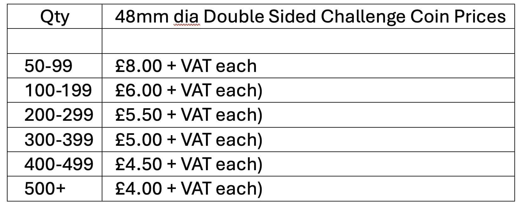 Challenge coins are typically supplied in batches of 50 or 100 and are well suited to wholesale and repeat orders. We retain moulds for repeat production, making future reorders straightforward and cost-effective.